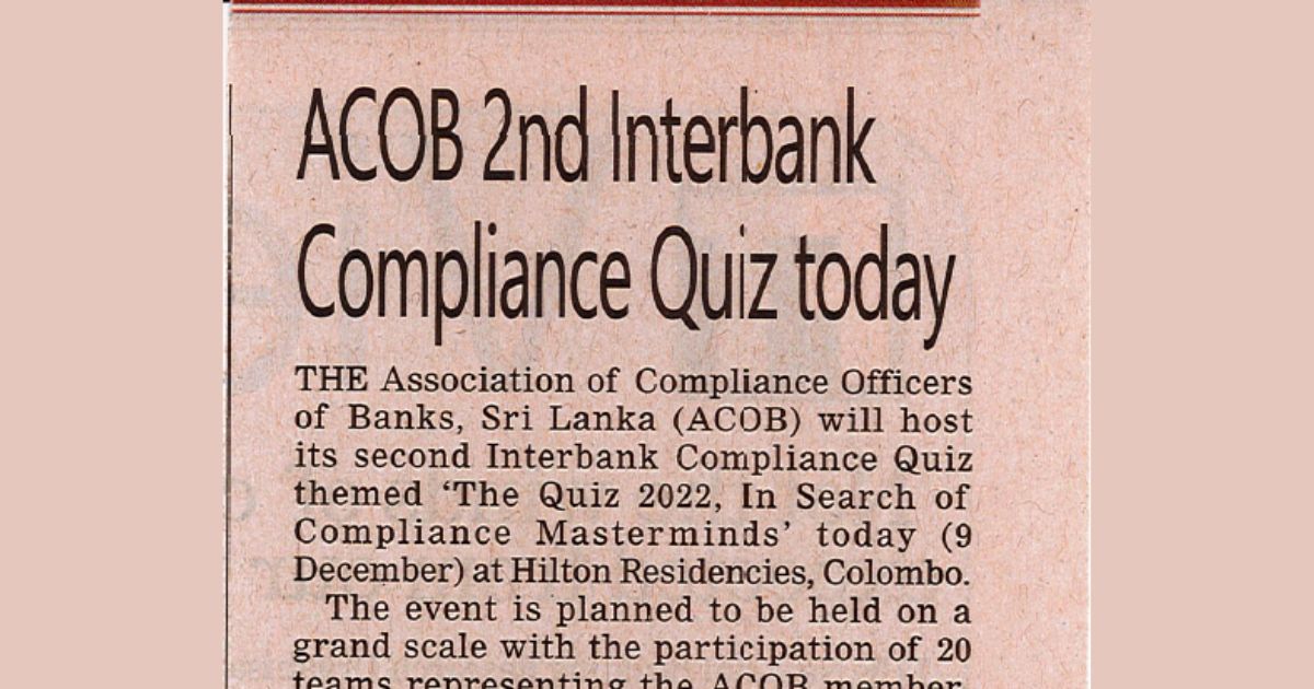 Association of Compliance Officers of Banks – Sri Lanka (ACOB SL) was formally established in 2010 with the objective of sharing experiences, knowledge and facing challenges common to compliance officers of banks in a more standardized manner and to set a level playing field on regulatory compliance among banks.